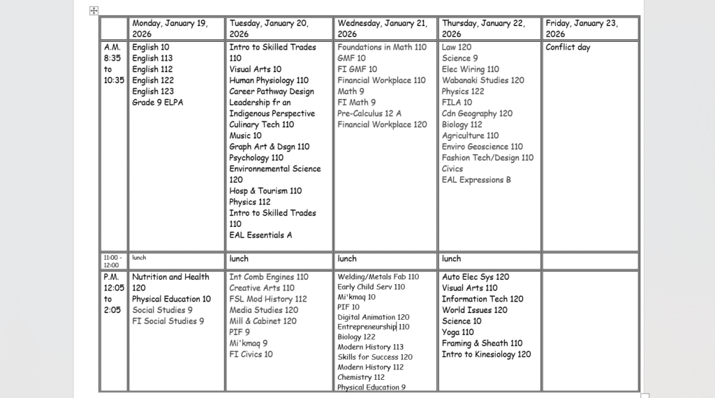 Please see the exam schedule attached. Note if there is a snow day please check our Facebook and Instagram for updates. If there is snow day the schedule will move forward by one day. For example, if the snow day was on Monday then the Monday exams go to Tuesday and the Tuesday exams to Wednesday…. As long as there are no snow days, classes will resume for second semester on January 28th.